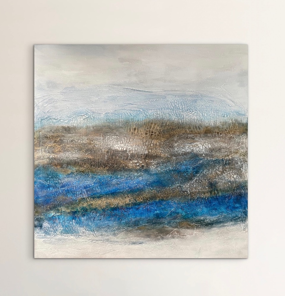 Acrylfarbe, Kreide, Pigmente, Tusche, Tinte treffen auf Sumpfkalk, Steinmehle, Asche, Sand oder Kaffee und einzigartige Strukturen werden so beeindruckend in Szene gesetzt. Oft genügt ein Impuls aus der Natur, eine Landschaftsaufnahme, ein farbiger Blumenstrauß um die Fantasie für die Ausarbeitung eines neuen Bildes bei der Künstlerin in Gang zu setzen.